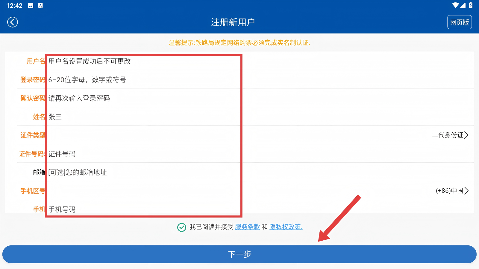 3、进入【注册新用户】页面,依次填写用户名、密码、姓名等信息,勾选同意条款后,点击【下一步】继续注册流程。