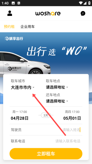 1、打开蜗享出行,点击【取车城市】