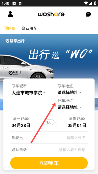 2、设置完成以后,点击【还车地点】