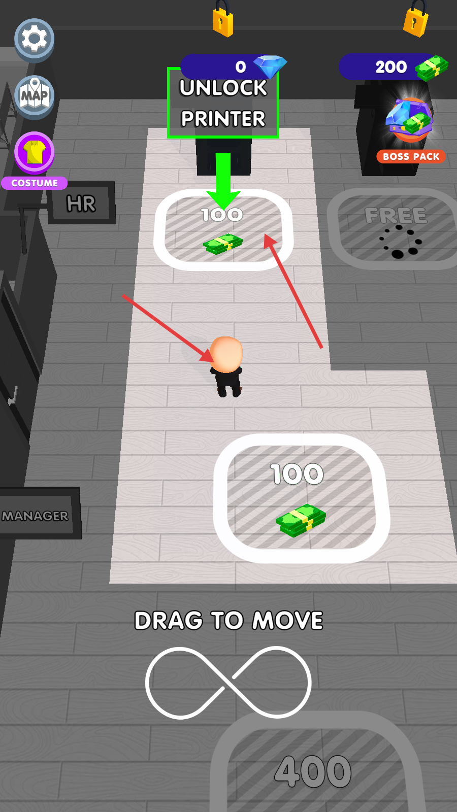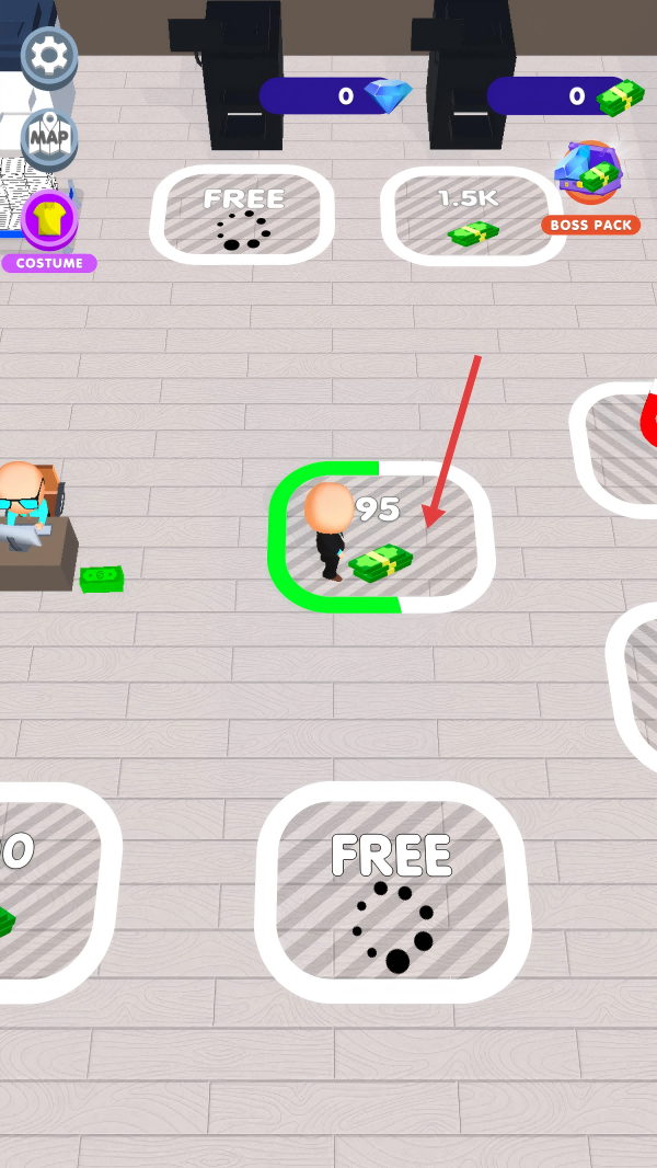 1、通过拖拽控制角色移动,收集标有金额的区域,获取资金。