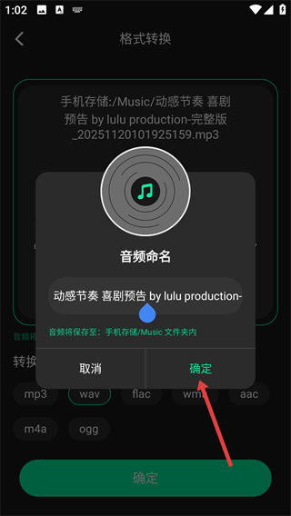 4、弹出音频命名窗口后,确认音频名称,点击“确定”按钮,完成音频格式转换。