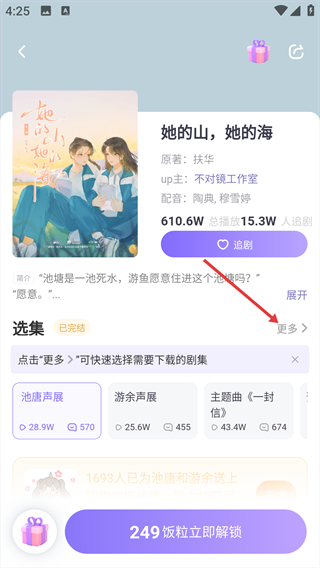 2、进入详情页面,点击【更多】按钮,展开完整的选集列表。