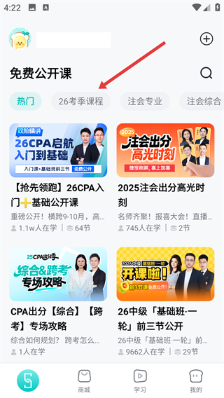 1、打开斯尔教育,在免费公开课板块点击【26考季课程】,切换到对应考季的课程列表呢。