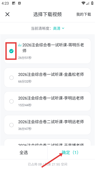 4、在选择下载视频界面,勾选要下载的课程,点击【确定】,就能开始下载视频啦。