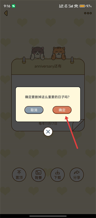4、此时会弹出确认弹窗,点击【确定】按钮,就能成功删除该纪念日呢。