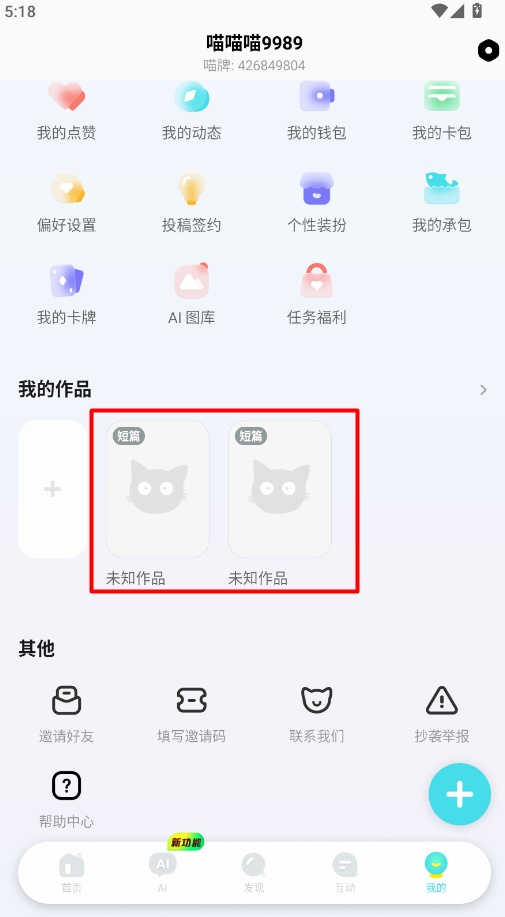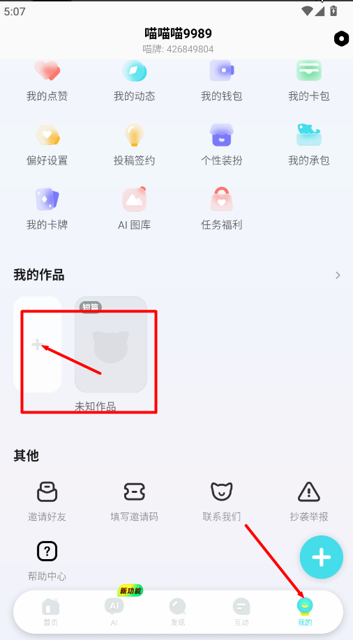 3、点击右下角 “我的”,在 “我的作品” 处点击 “+”。