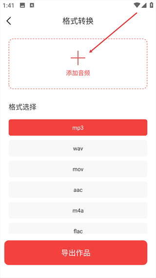 2、在【格式转换】页面,点击“添加音频”区域,进入音频选择页面。