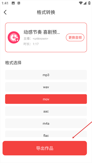 4、选择目标输出格式,确认后点击【导出作品】按钮,完成音频格式的转换操作。