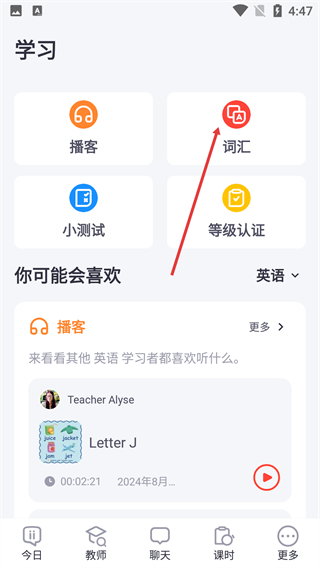 3、在学习页面,点击【词汇】选项进入词汇学习页面。