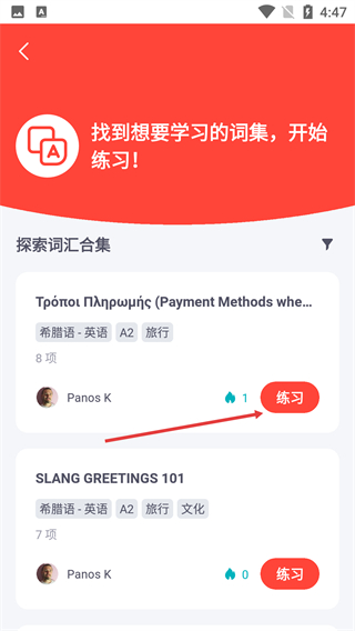 4、在词汇学习页,选择目标词集(如【Τρόποι-Πληρωμής】),点击对应的【练习】按钮开始词汇练习。