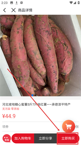 3、进入果蔬生鲜商品列表后,点击【河北坡地糖心蜜薯】条目,可进入该商品的详情页面。