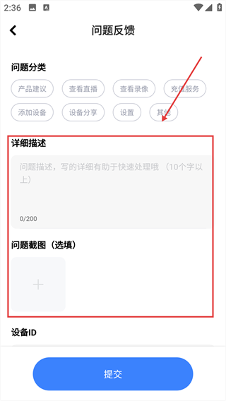 4、详细描述问题内容,完成后提交反馈内容。