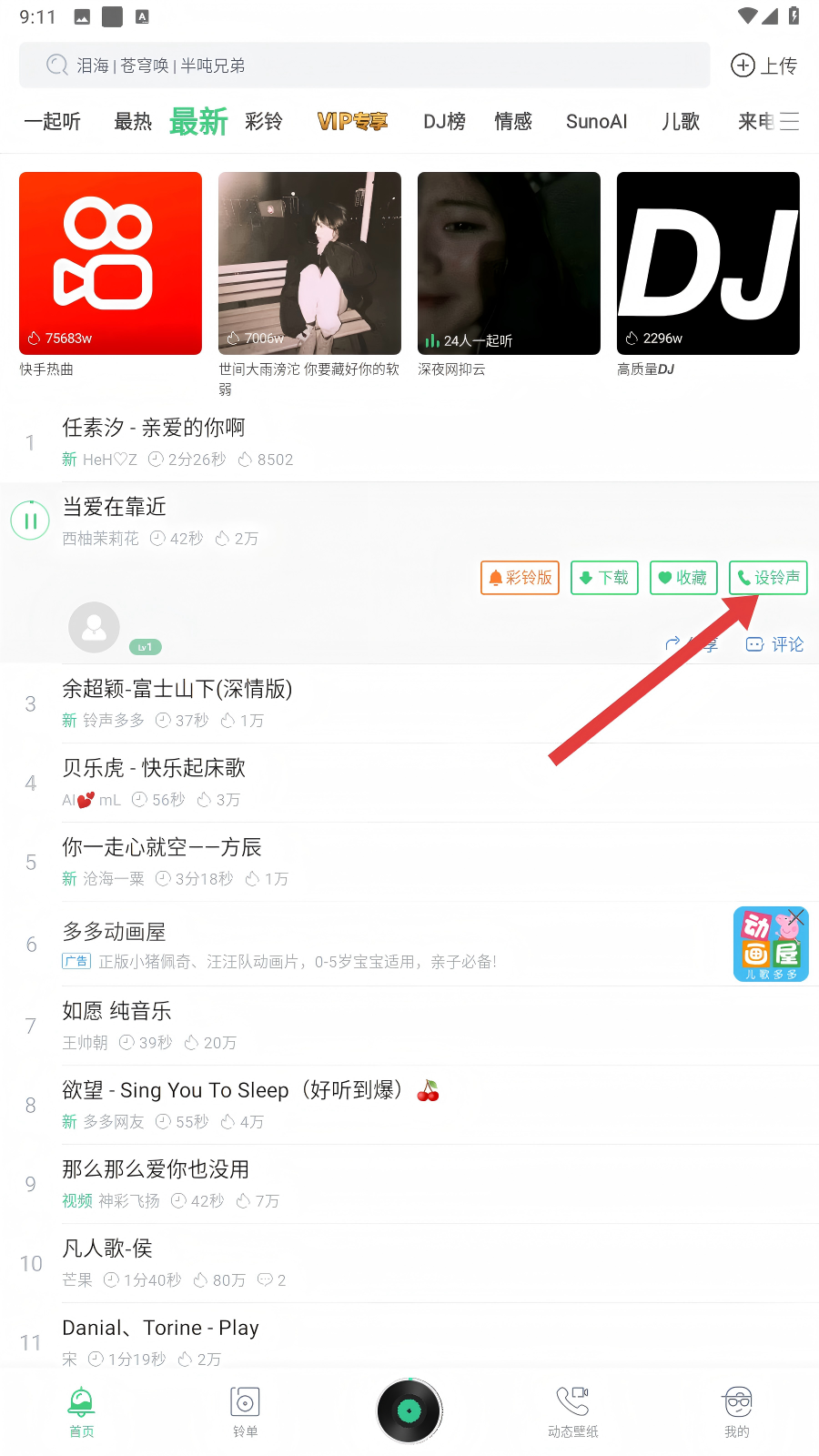 2、浏览【最新】分类下的铃声列表,点击心仪的铃声如【当爱在靠近】,就能进入该铃声的操作界面,为后续设置做好准备啦。