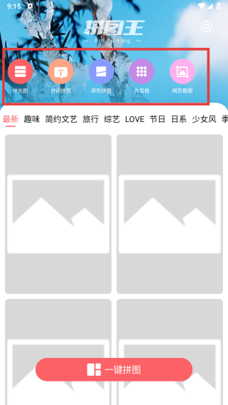 1、打开【拼图王】APP,在首页选择上方拼图类型(如拼长图、切多图等),进入操作流程。