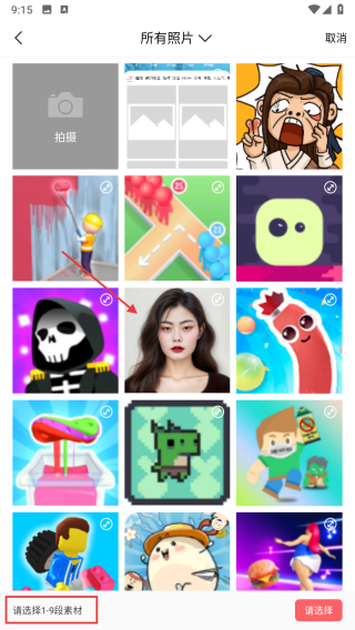 2、进入【所有照片】界面,挑选1-9张素材(满足【请选择1-9段素材】要求),选定后点【请选择】确认。