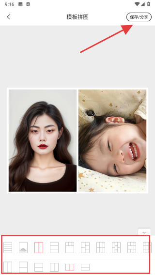 3、进入【模板拼图】,选喜欢模板布局,完成后点右上角【保存/分享】。