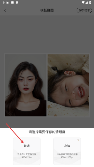 4、在弹出清晰度选择中,按需选【普通】或【高清】,完成拼图保存。
