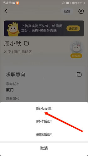 3、进入个人简历界面,点击右上角【齿轮】图标。