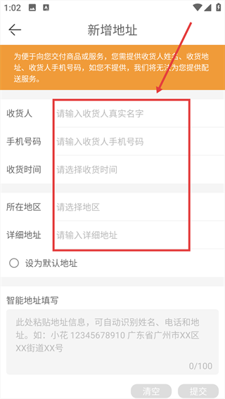 4、依次填写收货人、手机号码、所在地区、详细地址等信息,完成后可提交保存地址。
