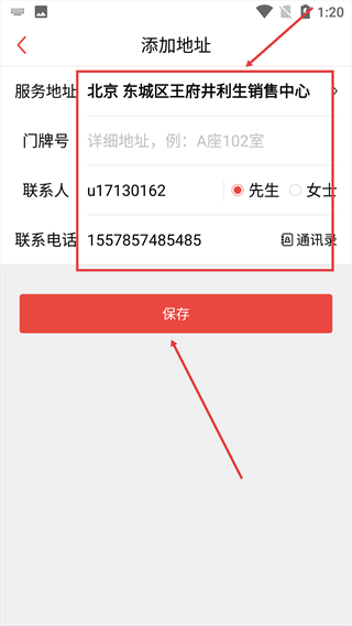 4、依次填写服务地址、门牌号、联系人及联系电话等信息,确认内容无误后点击“保存”,完成地址添加操作。