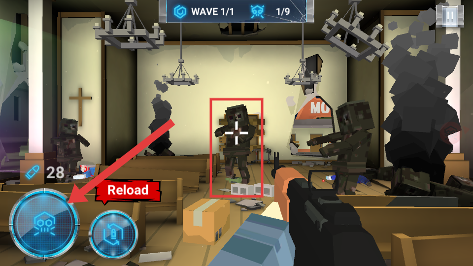 3、当僵尸出现时,移动视角瞄准僵尸后,点击左下方箭头按钮开枪射击。