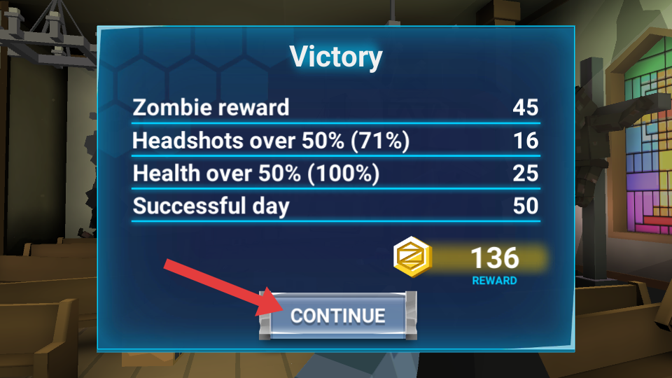 4、成功消灭所有目标僵尸后,界面显示【Victory】结算界面,点击【CONTINUE】按钮进入后续环节。