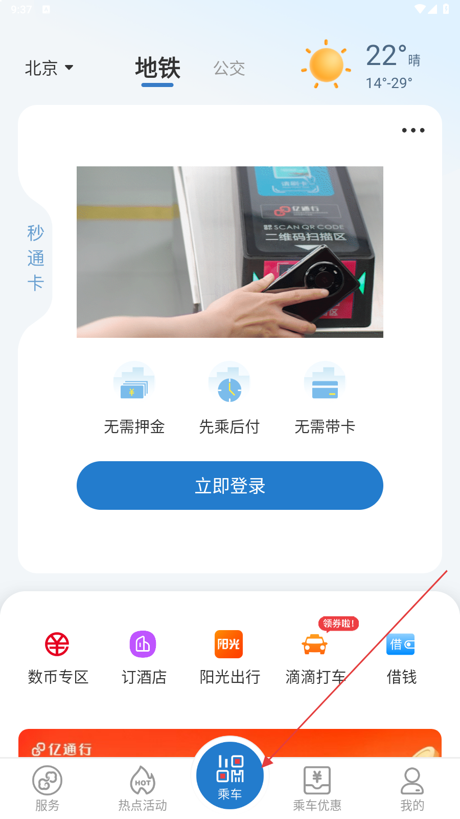 1、打开应用,点击底部【乘车】按钮,进入乘车相关界面。