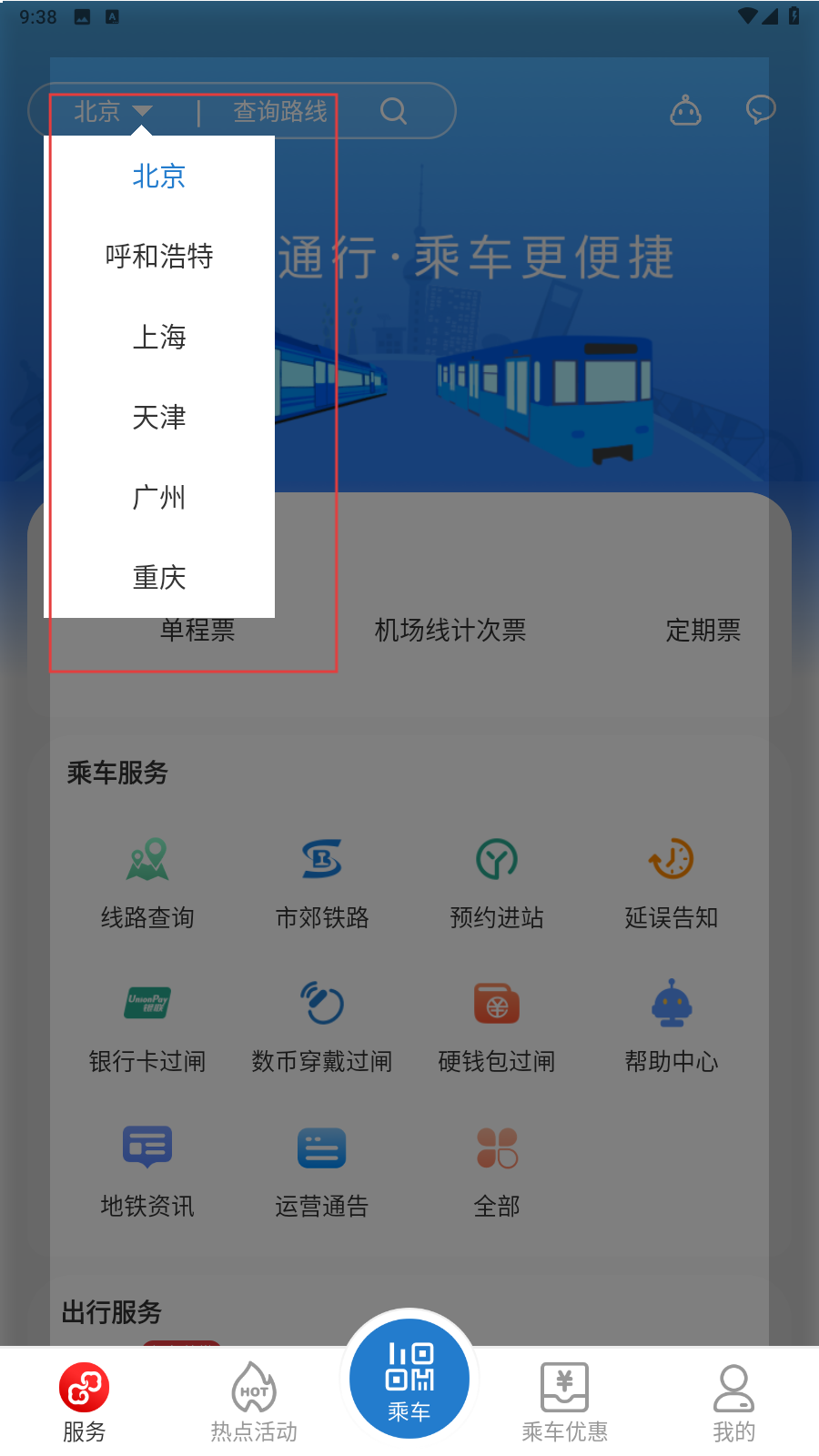 2、在乘车界面上方城市选择栏,按需选择【北京】【呼和浩特】等城市。