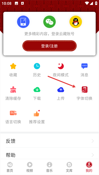 2、找到“字体切换”功能选项,进入字体切换设置界面。