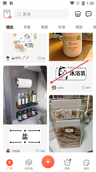 1、打开应用,首页顶部有【精选】【手帐】【家居】【妙语】【厨房】等分类标签,点击对应标签可浏览相关内容。