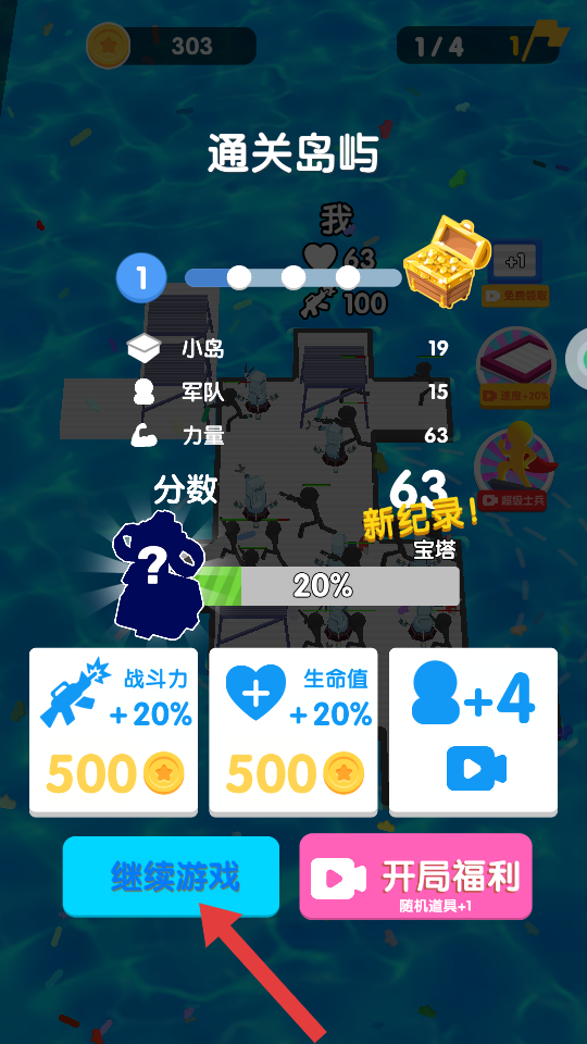 4、成功击败关卡敌人后,出现【通关岛屿】提示,查看各项数值,点击【继续游戏】进入下一关。