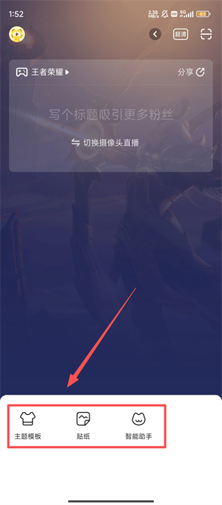 3、接着可点击下方的【主题模板】、【贴纸】等功能,给直播间添加好看的装饰,让画面更为出彩。