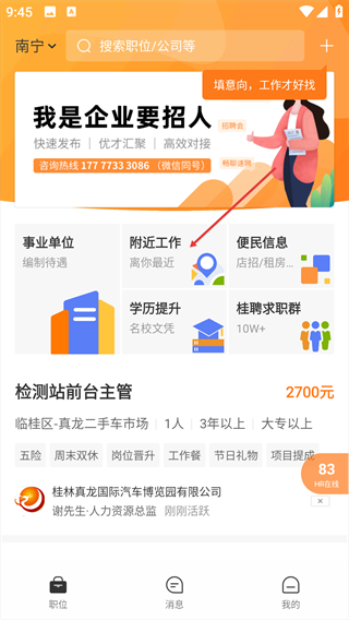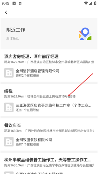 1、在APP【职位】页面,找到【附近工作】选项,点击可查看离自己最近的岗位信息。