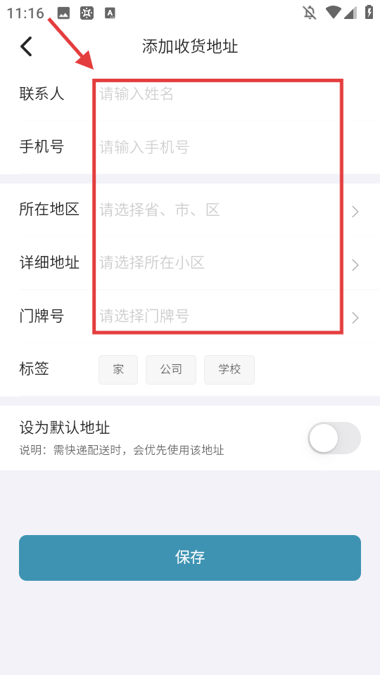 4、填写【联系人】【手机号】【所在地区】等信息后,点击【保存】,完成收货地址的添加操作。