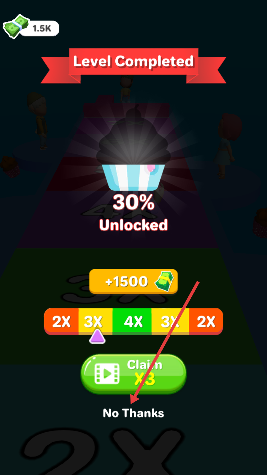 4、关卡完成后,可获得金币奖励,若不想观看广告获取额外奖励,点击【NoThanks】。