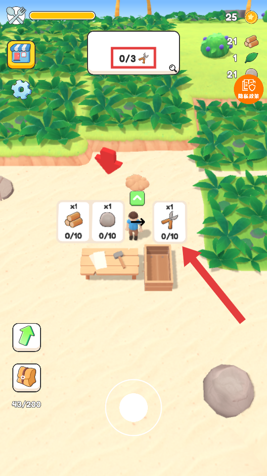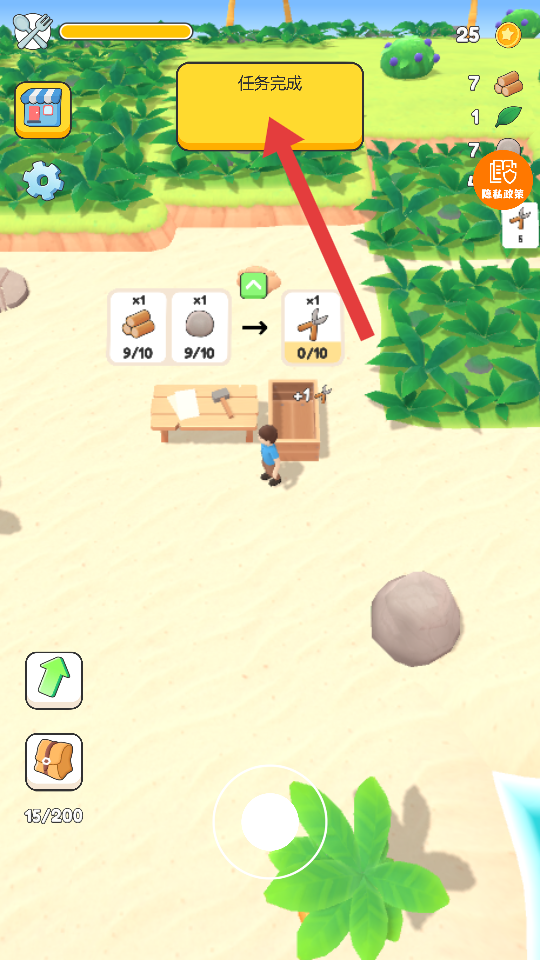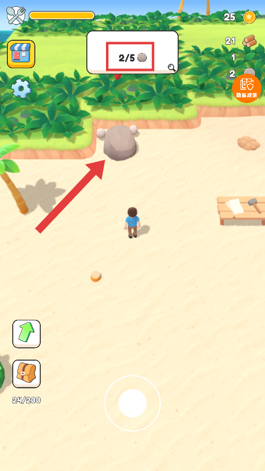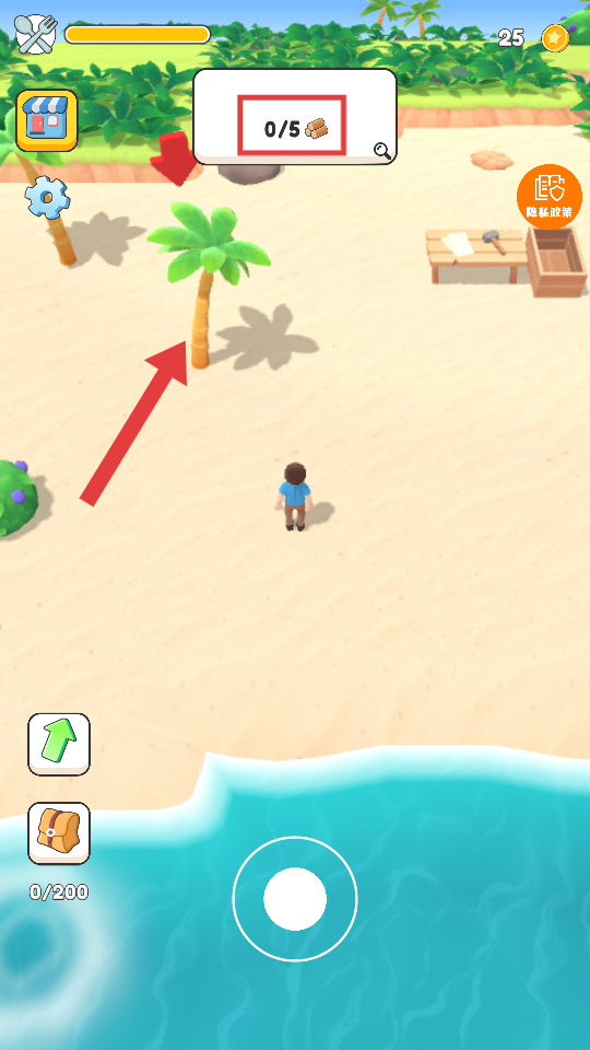 1、进入游戏,通过虚拟摇杆操控角色移动,按箭头指示砍伐【椰子树】获取【木材】,留意【0/5】的任务进度。