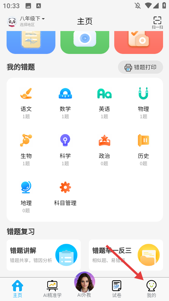 1、打开错题星App进入【主页】,利用【错题收集】【拍照答疑】等功能进行学习辅助,通过【语文】【数学】【英语】等科目入口管理各科错题。
