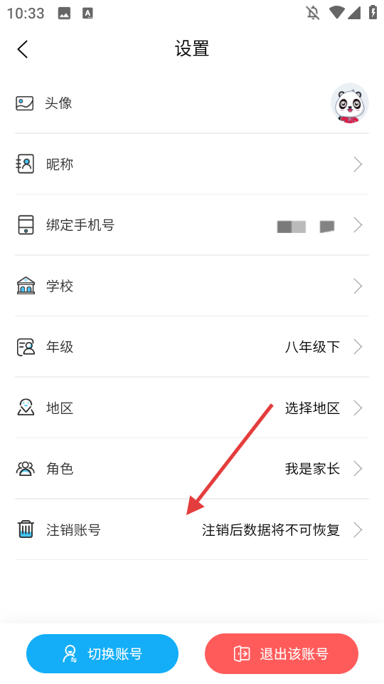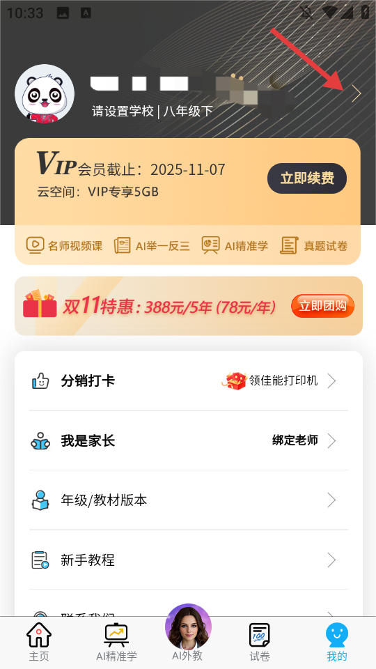 3、进入【我的】页面,点击【年级】设置学习阶段,或查看【新手教程】了解App使用方法,还可通过【登录/注册】获取完整功能体验。