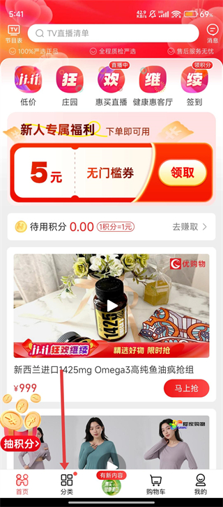 1、进入惠买APP首页,点击下方【分类】,开启购物之旅。