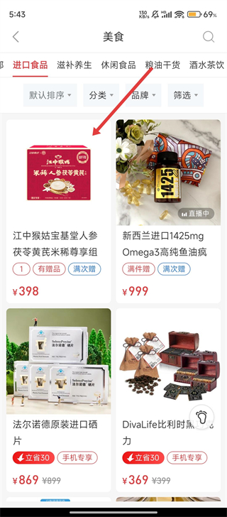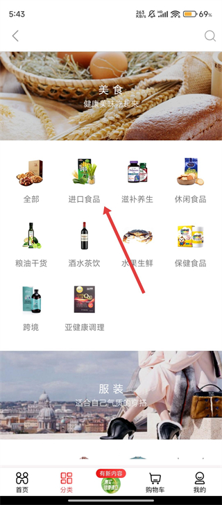 2、进入后找到【美食】分类,再选择【进口食品】,便能浏览相关商品啦。