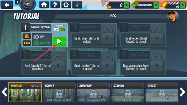 1、在【TUTORIAL】界面点击【1-DOWNHILL-TUTORIAL】的播放键进入关卡,完成后可解锁后续教程关卡。