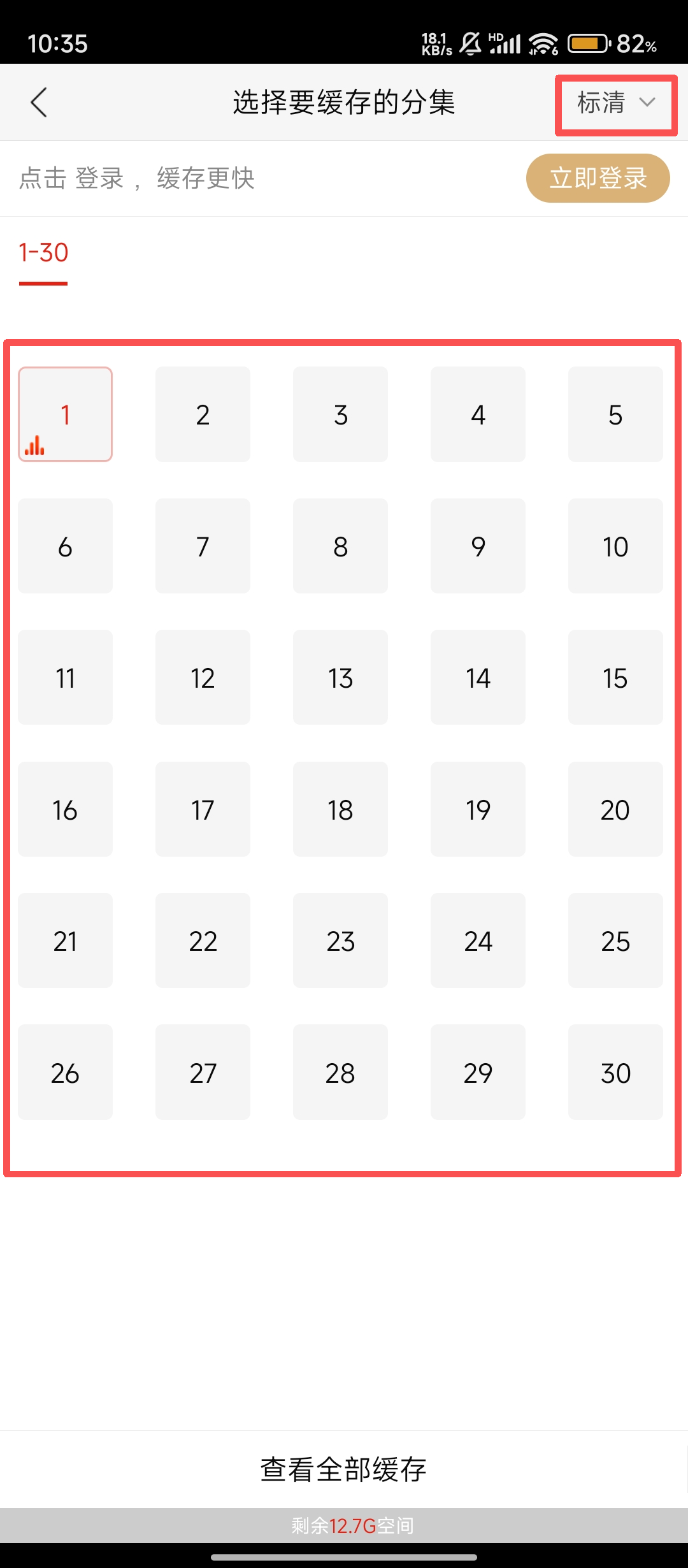 4、在缓存界面,选择要缓存的分集,还可点击【标清】选择画质,点击对应集数就能开始下载啦。
