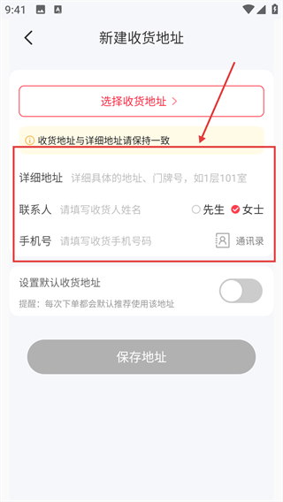 4、填写详细地址、联系人、手机号等信息,完成后保存地址信息。