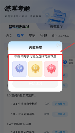 3、弹出【选择难度】窗口,可依据自身学习情况挑选适配的练习难度类型。