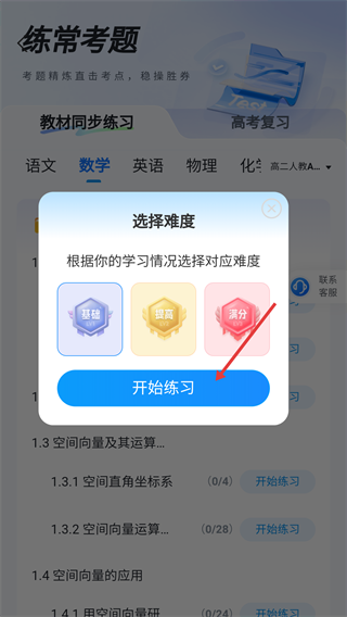 4、选定练习难度后,点击【开始练习】按钮,即可进入习题训练环节。
