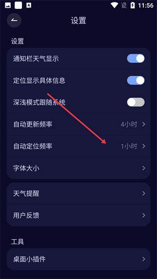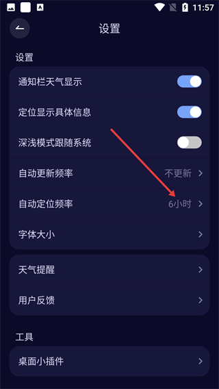 3、在设置页面,可通过【设置】【工具】等选项,进行基本设置、开启天气提醒、管理桌面小插件等操作;还能通过其他选项进行用户反馈、查看帮助须知等。