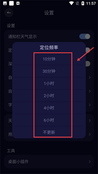 3、弹出【定位频率】选项列表,可选择【10分钟、30分钟、1小时】等不同的定位更新间隔。