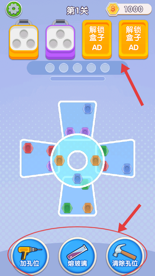 3、进入第1关,利用底部工具(加孔位、熔玻璃、清除孔位)操作彩色螺母,还可通过AD解锁盒子,完成关卡挑战。