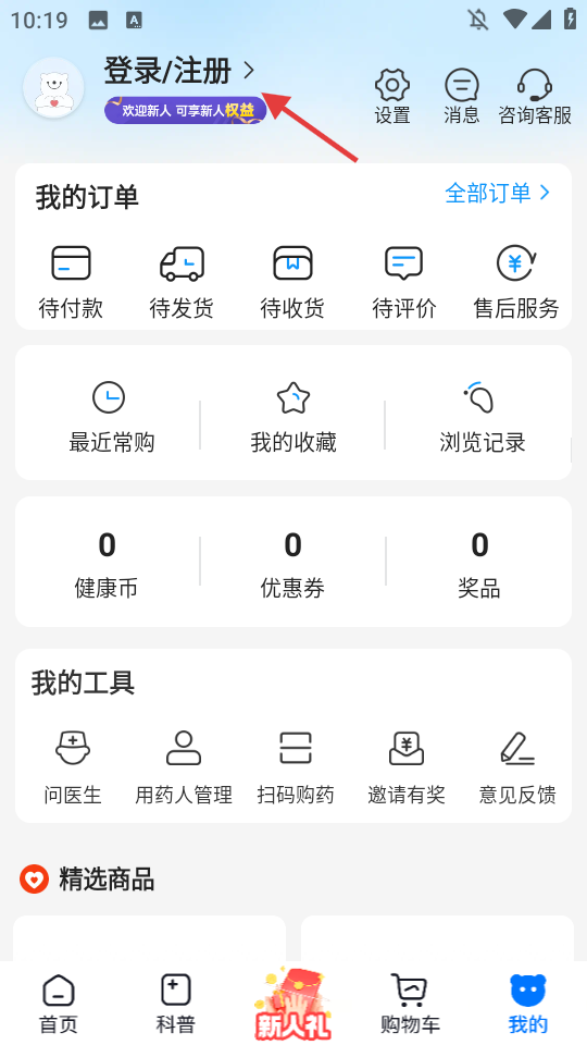 2、在个人页面点击【登录/注册】,进入登录选择界面。