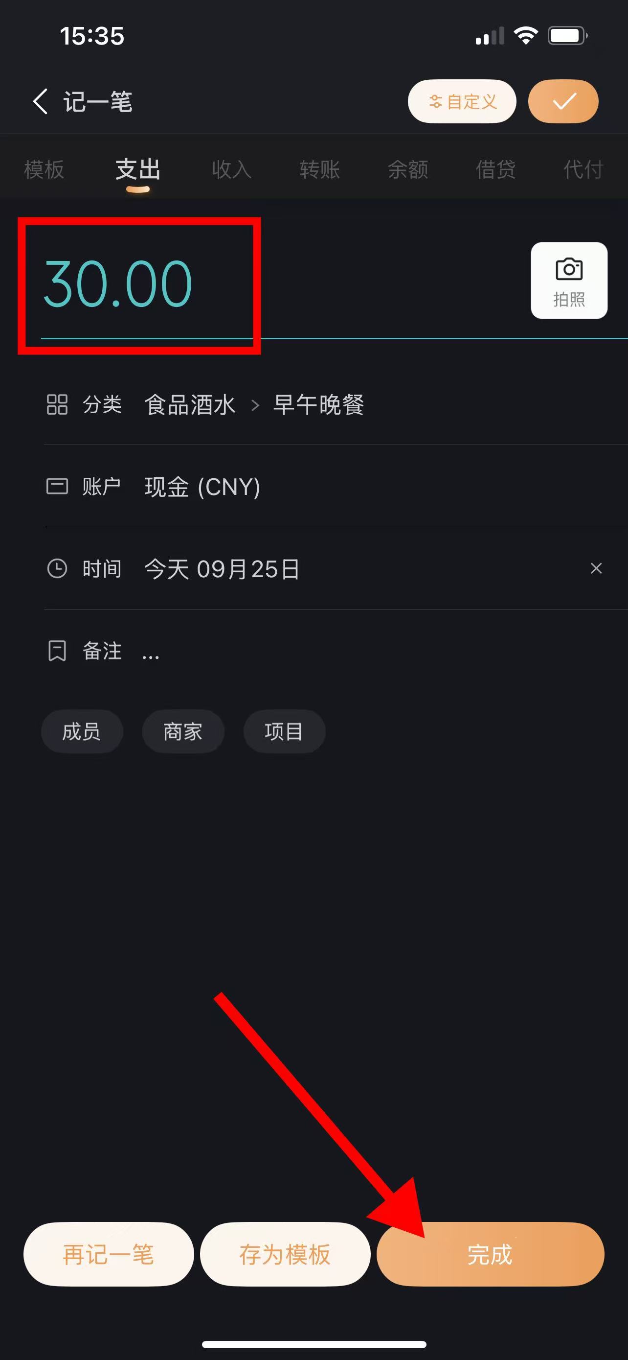 4、在记账页面,输入支出金额,点击【完成】,完成这笔支出的记账操作。